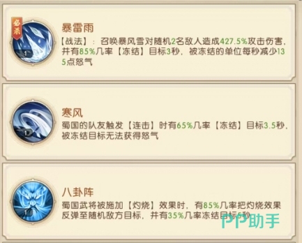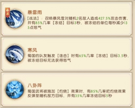 在这款游戏中的诸葛亮,技能暴雷雨作为他的战法,展现出强大的控制与伤害能力,诸葛亮召唤出如暴风雪之类的元素力量,随机对两名敌人造成高达427.5%的攻击伤害,同时该技能附带85%的高几率使目标陷入冻结状态长达3秒,被冻结的单位不仅行动受限,还会每秒减少135点怒气,延缓了敌人的技能释放节奏。