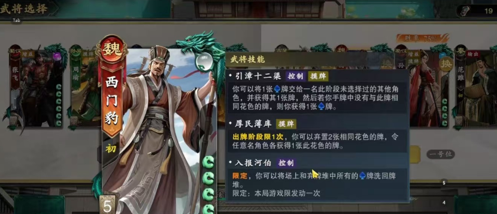 定位为功能性辅助武将,核心价值在于手牌调度与团队资源再分配。一技能“恤民”可将一张花色牌赠予本回合未被选中的队友,同时自身摸一张牌;若西门豹当前手牌中无该花色,则自动向全体队友各发放一张对应花色牌,大幅提升队伍整体出牌连贯性与响应能力。该机制在多段协作、连锁控场类对局中尤为关键,是构建稳定运营体系的重要支点。