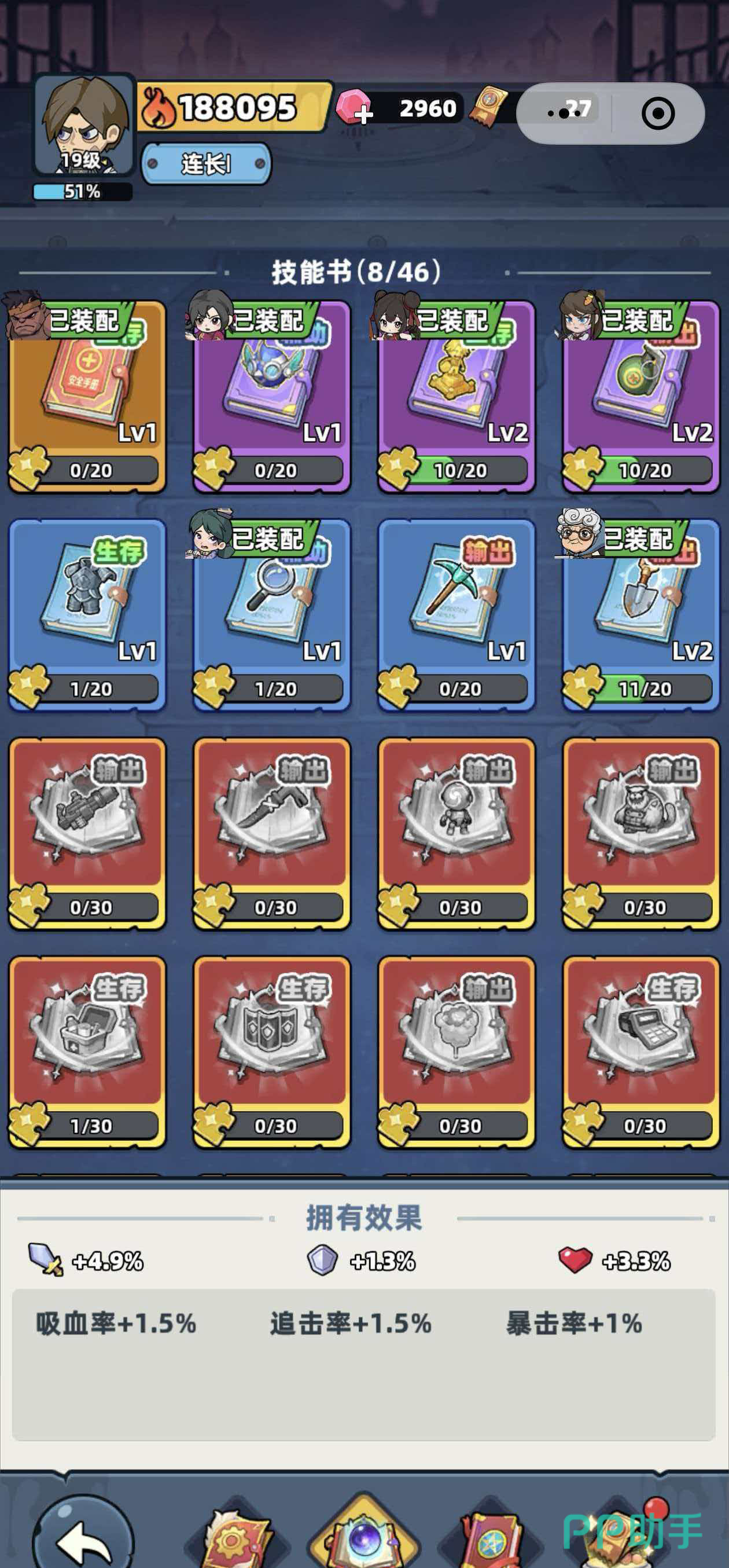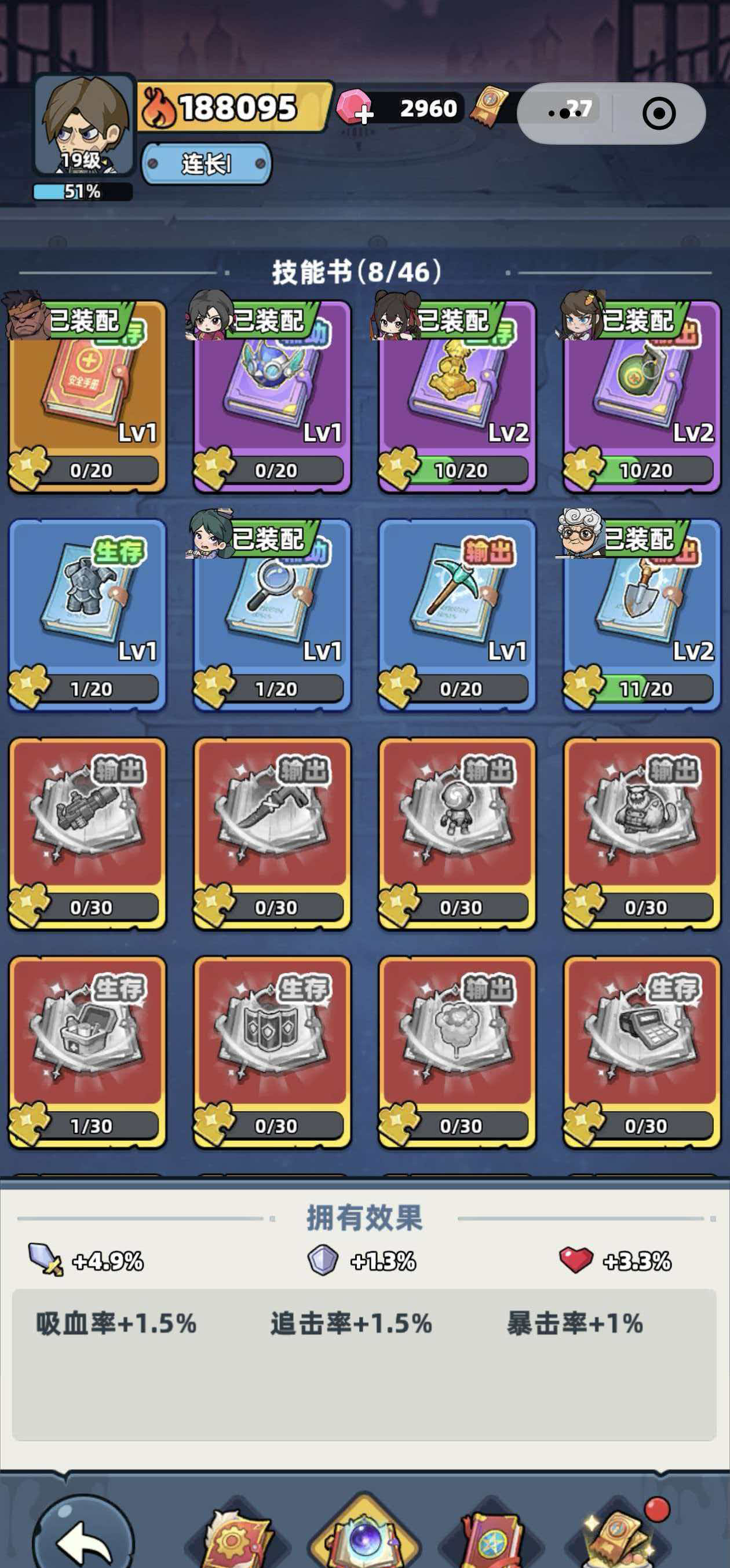角色战力提升由两大支柱构成:等级成长与技能体系构建。技能书不仅决定主动/被动技能的习得与升级,更通过基础属性加成(如生命、攻击、暴击率、抗性等)强化职业定位。例如,侧重近战输出的角色可优先配置提升物理伤害与攻速的技能书;而辅助型角色则更适合选择增强治疗量或团队增益持续时间的技能书。