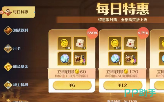 最后就是商城中的每日特惠板块。该板块中所出售的物品一共有4样,分别为招募券、龙币、抽奖和幸运宝箱,根据价格的不同,所包含的数量也会有所区别,不过全部都是相当划算的,同样也是非常推荐各位购买。