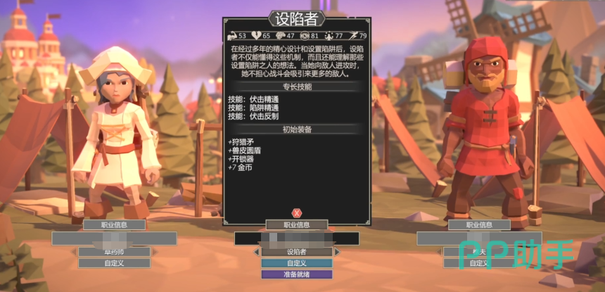 考虑到设陷者拥有较高的敏捷属性,建议在组队时为其配备具备治疗能力的角色以增强续航。推荐阵容为:设陷者 + 草药师 + 流浪汉。草药师不仅能提供稳定回血,还可施加持续中毒效果;设陷者可通过提前布设绊索陷阱限制敌方行动,配合毒伤实现有效控场与消耗;流浪汉则具备均衡的属性成长和多武器适应性,无论是持盾防御还是反击输出都能胜任,使整体队伍更具应变能力。