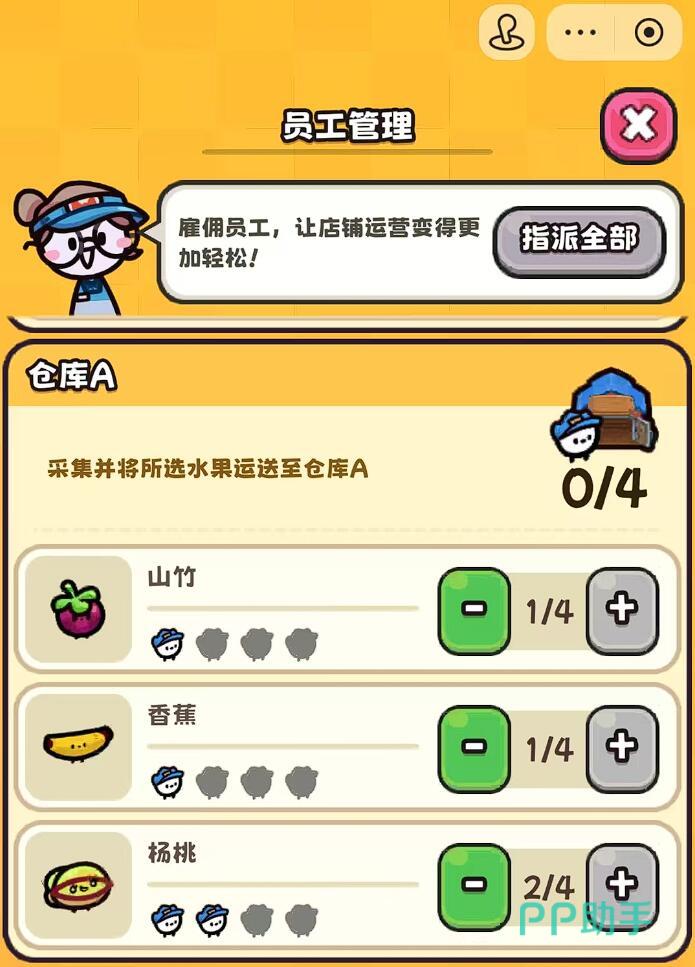 仓库主要用于存放各类水果产出,操作上支持长按拖动进行同类批量转移,单次上限为20个单位;双击货架可自动按保质期由近及远排序,便于优先处理临近过期的果实。建议将1号货架用于草莓、葡萄等高频流转品类,2号货架放置苹果、橙子等中周期水果,3号货架则专用于西瓜等体积较大的品种,避免占用高周转区域。