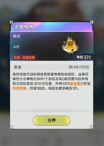小黄鸭定位为兼具功能性与趣味性的辅助型幻兽,外形萌趣,机制扎实。其核心技能“天降鸭鸭”可在战场上召唤巨型小黄鸭,对指定单体目标及其相邻两个单位造成一次物理伤害,并有100%基础概率施加“压力”效果。该效果持续1回合,使受影响敌人每回合固定降低5%攻击力与5%防御力,属于可叠加干扰类减益,在多回合推图及BOSS战中具备显著战术价值。