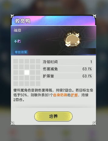 保命技“救命鸭”则在小黄鸭或其主人受到伤害时自动触发:当目标当前生命值低于50%时,除提供伤害减免外,还将生成一个基于自身防护数值的护盾,持续2回合。该护盾与减伤效果共同构成双层生存保障,显著提升战斗容错率。