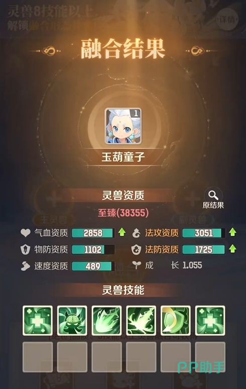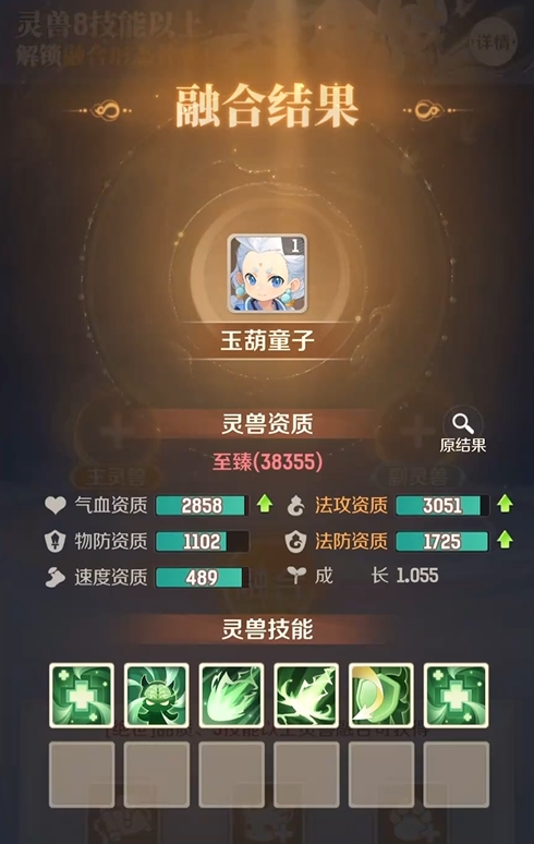 合宠存在严格的准入门槛:主灵兽与副灵兽均须为“绝世”品级,低于该品质的灵兽不可参与。此外,副灵兽所拥有的技能数量不得少于主灵兽当前技能数。例如,若主灵兽已拥有5个技能,则副灵兽至少需具备5个及以上技能方可作为胚子使用;技能数量不足者将被系统直接拦截,无法进入合成流程。合成完成后,主灵兽的资质数值与技能列表将即时更新,玩家点击“刮开结果”即可实时查看本次合成的具体变化。