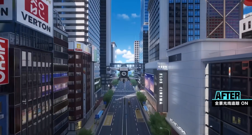 实测显示,光追技术在多个场景维度显著强化画面真实度:雨雪天气中水汽散射更趋自然;金属与玻璃材质表面呈现精准镜面反射;动态水体可实时生成环境倒影;云层则具备多层透光结构,明暗过渡富有纵深感。这些细节共同构建出更具可信度的游戏世界。