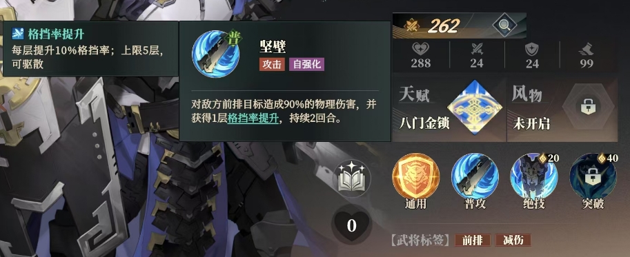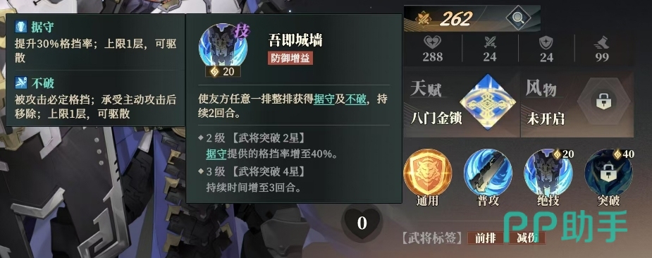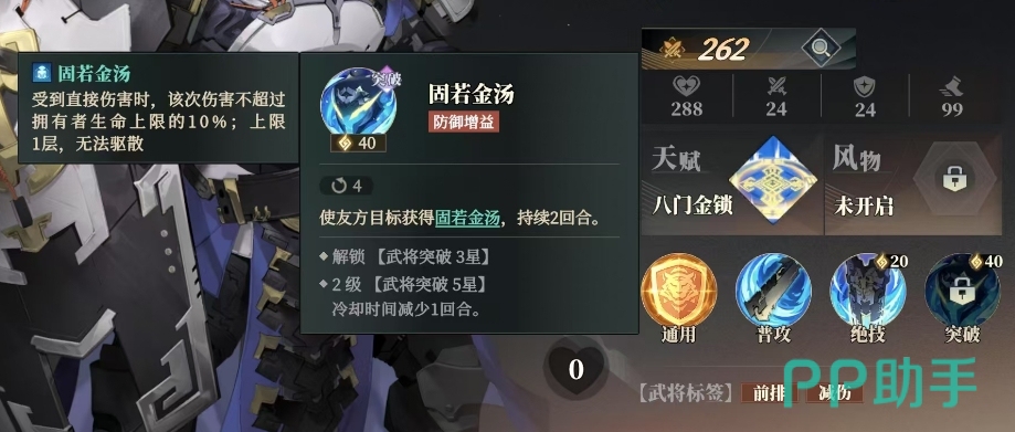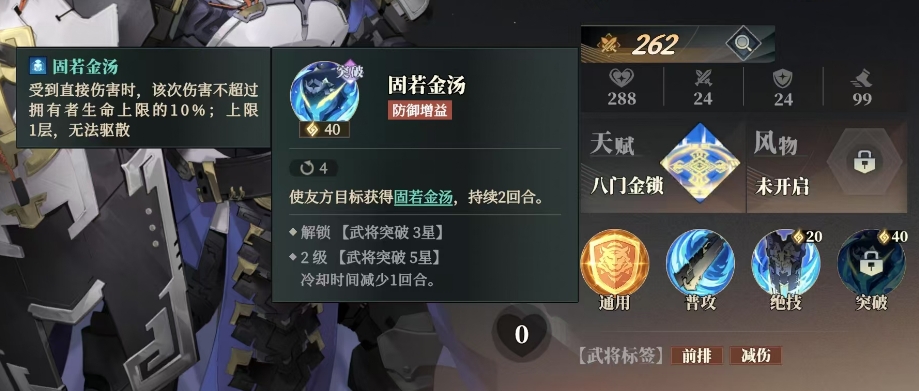 其突破技能固若金汤可在武将突破至 3 星时解锁,2级武将突破 5星后冷却时间减少 1回合,该技能能使友方目标获得固若金汤效果,持续 2回合,在受到直接伤害时,此次伤害不会超过拥有者生命上限的 10%,上限为 1层且无法被驱散。