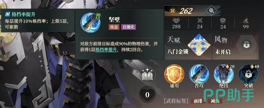 曹仁的普攻名为坚璧,具有攻击附带自强化的特点,能够对敌方前排目标造成 90%的物理伤害,并使自身获得 1层格挡率提升,每层可提升10%的格挡率,上限为 5层,不过这一效果可被驱散。