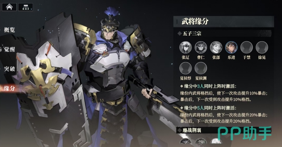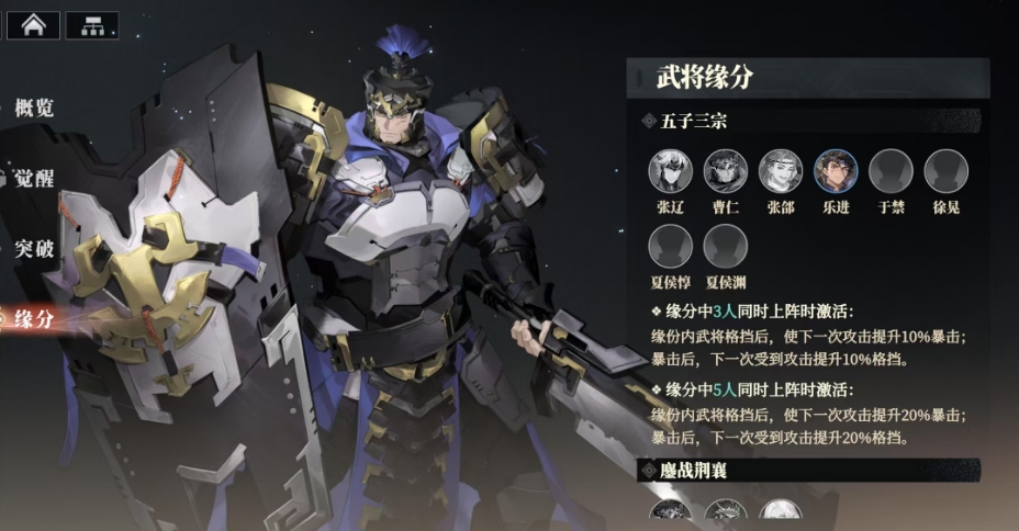 曹仁的武将缘分也颇为实用,其中一个是五子三宗,当他与张辽、张邰、乐进、于禁、徐晃这几位武将共同上阵时,能够触发强大的缘分效果,当缘分内任意 3 人同时上阵,每次武将格挡成功后,下一次攻击便会提升10%的暴击率,若此次攻击暴击命中,那么下一次受到攻击时又会提升10%的格挡率,而当缘分内任意 5 人同时上阵时,格挡后的攻击暴击提升效果将增强至 20%,暴击后的格挡提升也同样提升至 20%,这种攻防转换的增益效果还是很实用的。