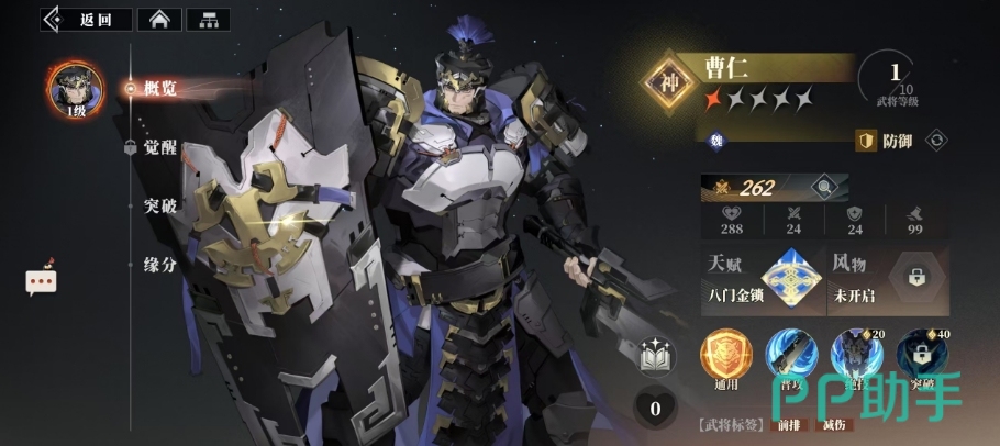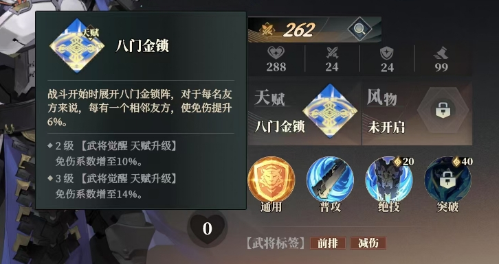 曹仁的天赋为八门金锁,战斗一开始的时候,他就会展开八门金锁阵,此阵效果还是很明显的,对于每名友方而言,只要其相邻位置存在友方,那么该友方的免伤就能提升 6%,并且随着曹仁在武将觉醒天赋升级方面的进阶,2 级时免伤系数会增至10%,3 级时则进一步提升至14%,这一天赋技能也增强了友方在战斗中的生存能力,尤其是在面对群体攻击或敌方强力输出时,能有效保障队伍的整体血量。