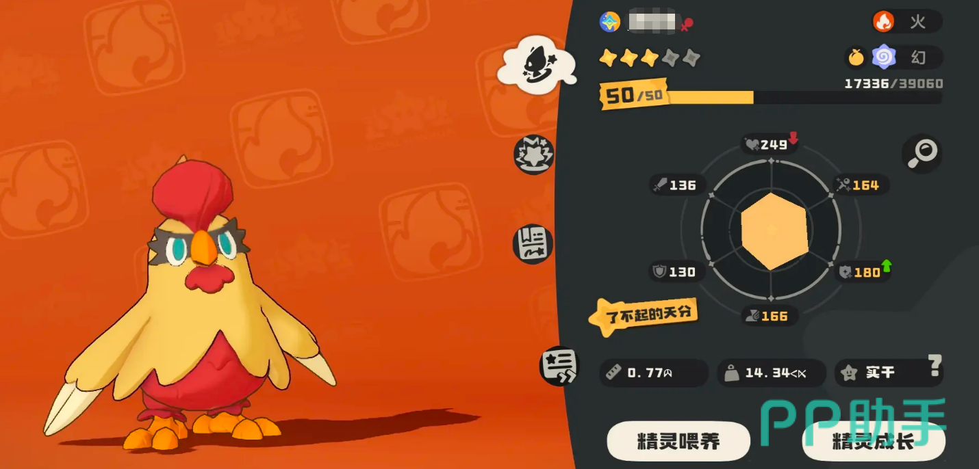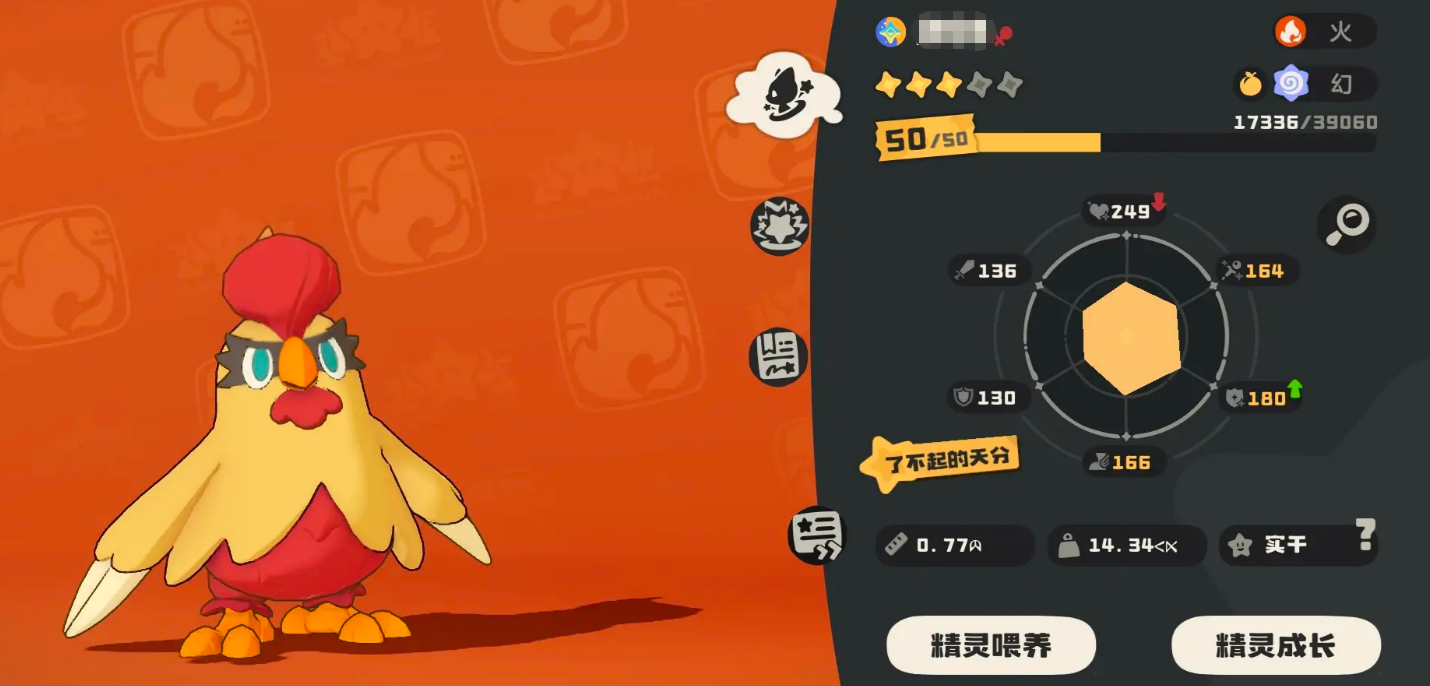 作为一只纯火属性精灵,晕晕鸡在面对属性克制明显的对手时会略显吃力,这是单属性精灵普遍存在的短板,尤其在游戏后期遭遇多属性复合型敌人时更为明显。不过它的总种族值达到500,属于中等偏上的水平,各项能力分布均衡,既没有突出的攻击面板,也无显著的防御优势,整体定位偏向于稳定输出型角色。虽然缺乏爆发亮点,但胜在表现平稳,适合多种战组合搭配。