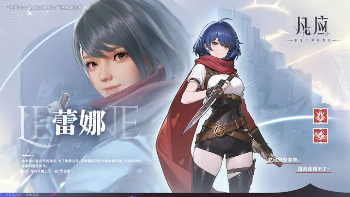 蕾娜以清爽的蓝色短发示人,穿搭利落大方,展现出干练飒爽的少女形象。她是达卡斯的海引,原本为了家庭生计努力争取在此地长期居住的权利,并依靠自身能力保障家人安稳生活。在遇见主角后,内心燃起冒险热情,从而踏上全新的旅程。