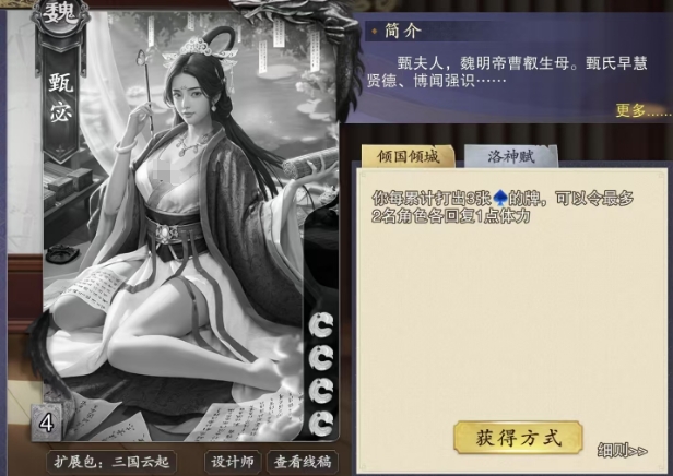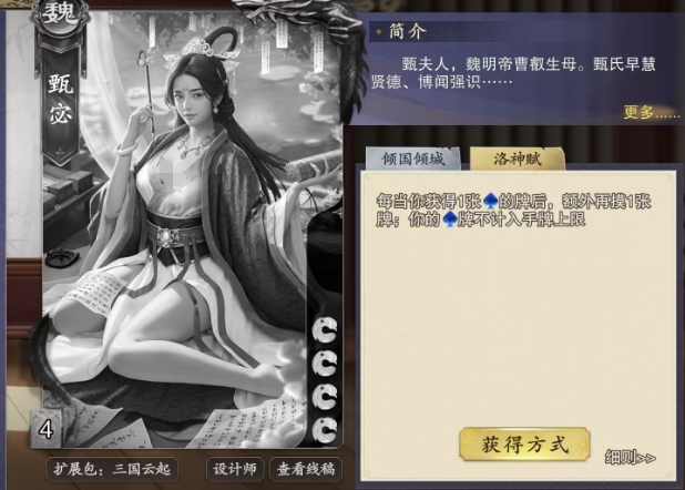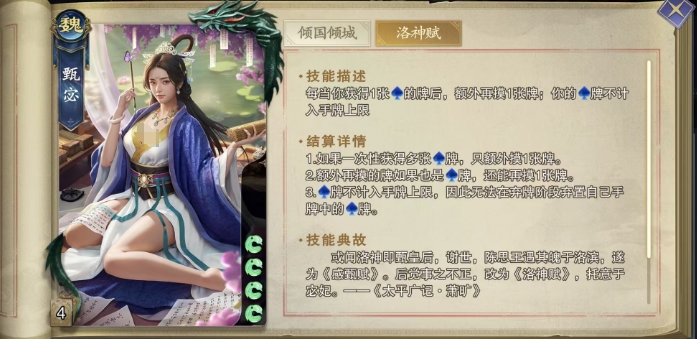 这个额外摸牌的效果并不仅限于甄宓初次获得的水属性牌,即使是通过其他方式,如其他角色的给予或技能效果获得的水属性牌,也能触发这一效果,拓宽了甄宓的摸牌渠道,同时洛神赋技能还赋予了甄宓对水属性牌的无限掌控力,在游戏常规规则中,手牌数量往往受到严格的限制,但甄宓的水属性牌却不计入手牌上限,这意味着在理论上,她可以无限地保留水属性牌,无需担心手牌溢出的问题。