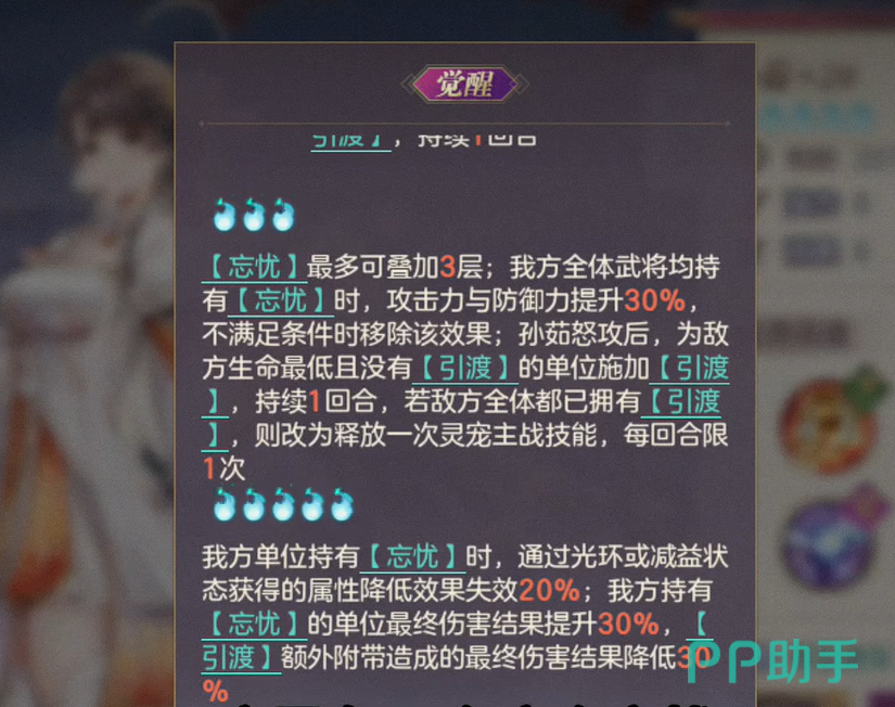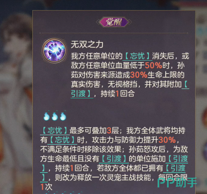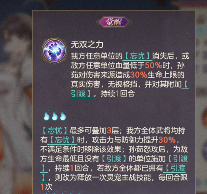 至于觉醒无双状态下的“无双之力”,更是让孙茹的威胁值倍增。当敌方血量低于50%时,她可以对敌人造成30%生命上限的真实伤害,并附带“引渡”效果。这个效果非常有趣,敌人一旦陷入“引渡”状态,便会遭遇致命伤害后不能转移的“魅惑”,一旦触发,这一状态将极大削弱敌方的反击能力,让孙茹的团队更具优势。