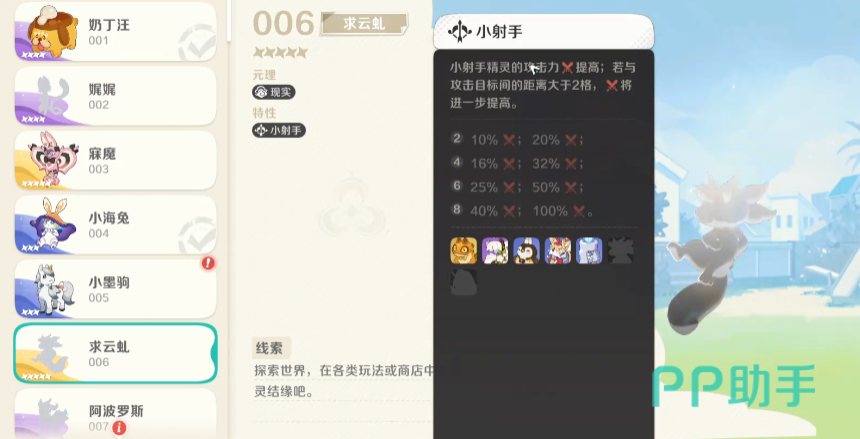 “小射手”类精灵普遍具备基于距离的攻击增幅机制。当目标与自身间隔超过两格时,基础攻击力提升效果将翻倍生效。单个“小射手”通常提供10%的攻伤加成,若场上存在多个同类型单位,则可叠加至最高8名。在满配情况下,基础加成为40%,而当所有单位均与敌人相距两格以上时,最终加成可达100%。求云虬作为该体系的一员,能够充分受益于此类机制,尤其在拉开站位布局时,输出能力显著增强。