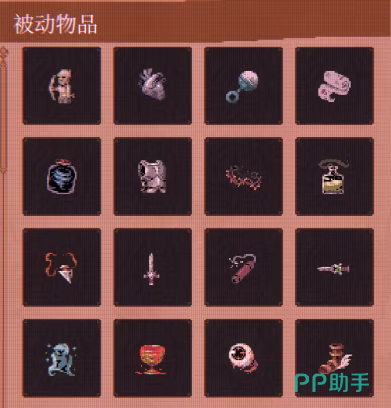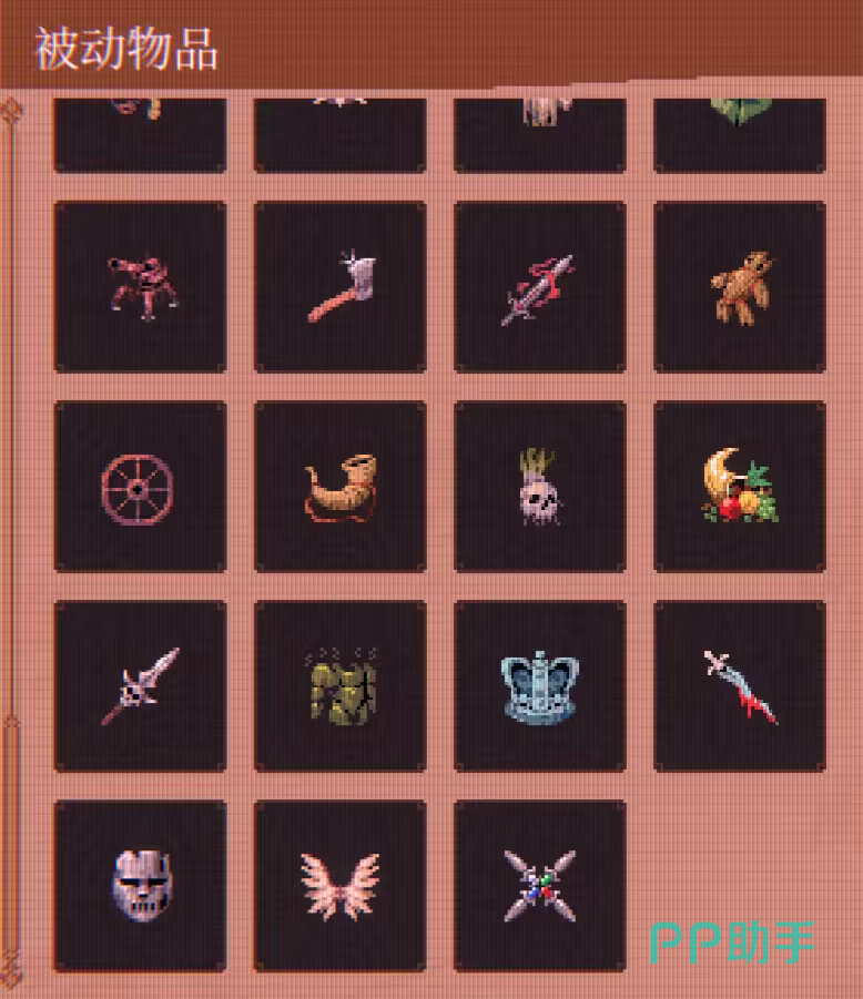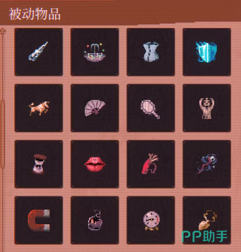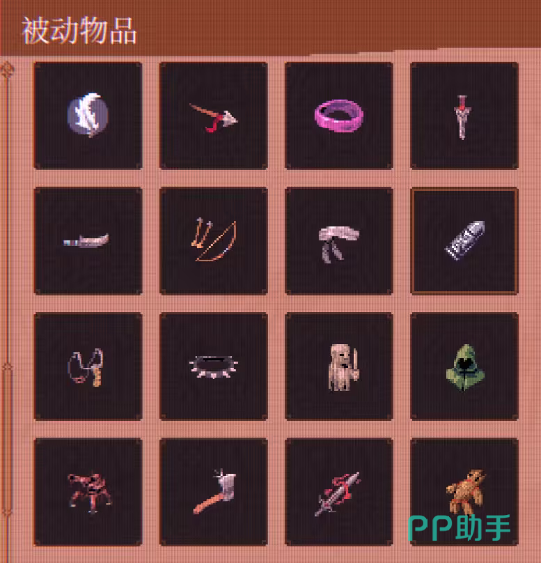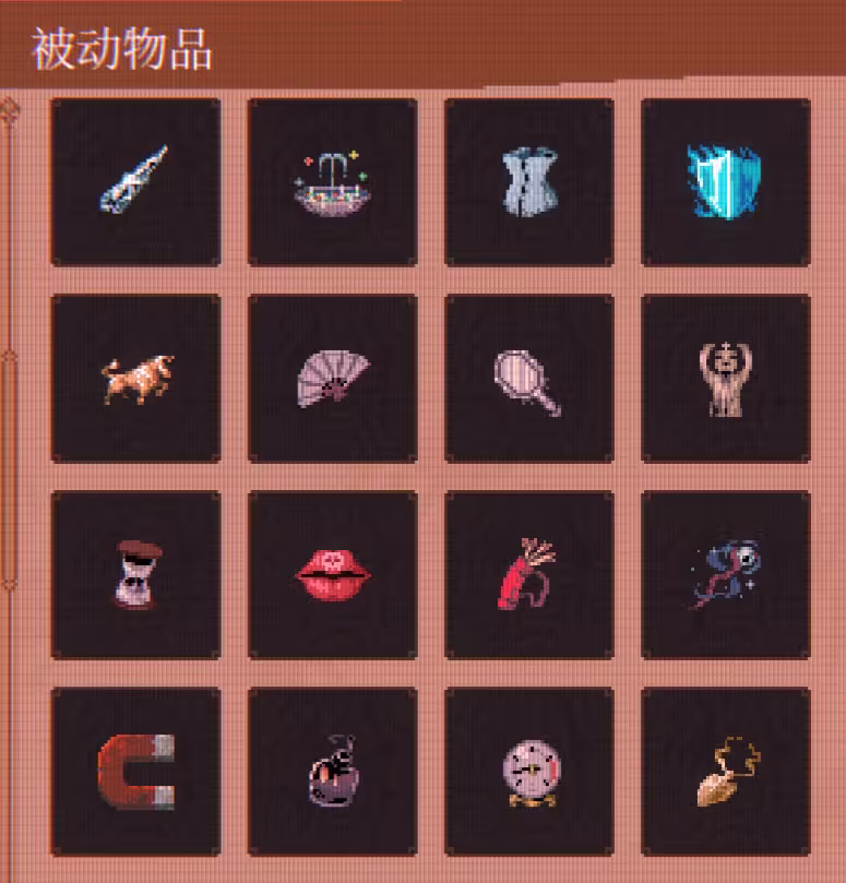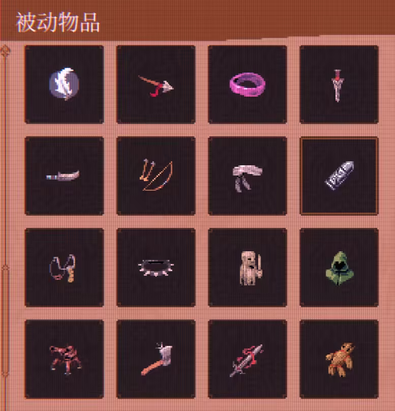 被动物品分为“基础被动”与“合成被动”两类:前者可直接通过关卡掉落获得,后者需在局内特定条件下,由两个指定基础物品组合生成。所有被动物品均关联图鉴系统,玩家在单局中首次拾取后即解锁对应条目。当前图鉴共收录前51个基础被动物品,覆盖攻击、防御、机动、续航等多维属性维度。