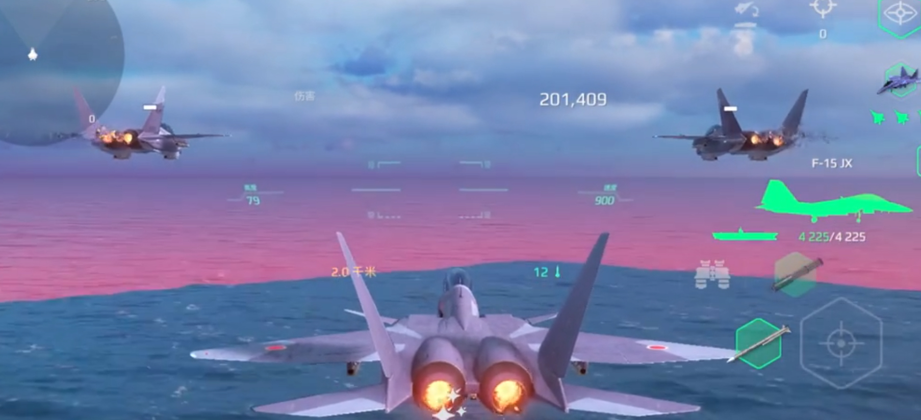 首先是关于F15jx的各项属性值,在满级情况下,它的耐力值为4225,速度113.7节,机动性136.5,雷达范围8千米,最高时速134.7节,航空储备12件。在实战中,F15jx的最高速度为900,中速为760,最低速度为233。俯冲最高速度为980,中速为826,最低速度为253。在机动性能上,F15jx旋转一周用时为4.23秒。在速度上,F15jx的表现是非常不错的,但是机动性较差。