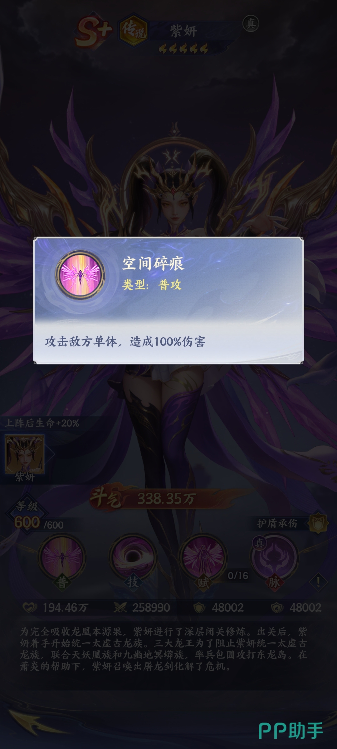综上所述,《斗破苍穹:传说》中的紫妍是一位机制扎实、成长路径清晰、战术价值突出的顶级防御向角色。其核心数值如【空间碎痕】(普攻)、【太虚宙灭】(大招)、红四星(伤害分摊)、白金三星(护盾强化)、紫炎血脉等关键设定均保持原作设定不变。合理规划她的星级晋升与血脉激活节奏,是构建高韧性、高容错战斗体系的重要支点。