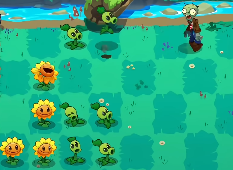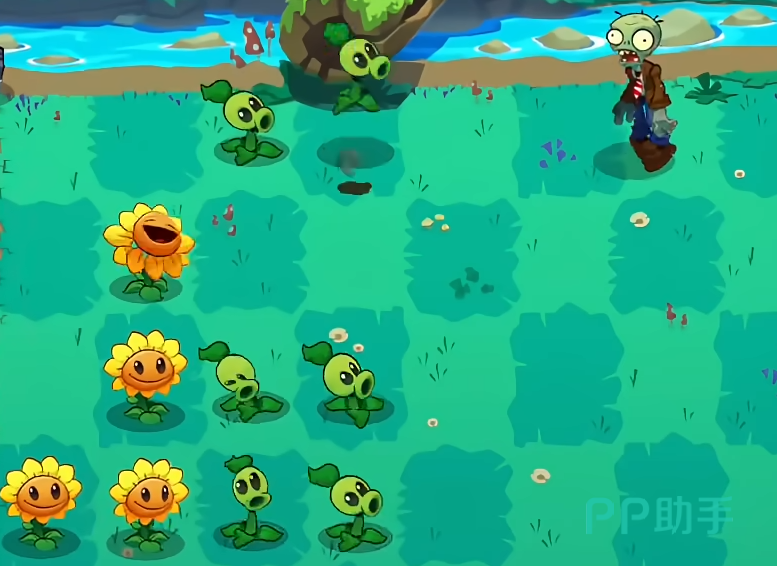 星星僵尸通常出现在第三行,出场时间较早,需提前布局应对。清除目标后,其他普通僵尸也将陆续登场。前期大部分敌人集中在前三行,第四行仅有少量刷新,因此豌豆射手的布阵应优先覆盖前三行,待前段防线稳固后再补充最后一行的火力配置。
