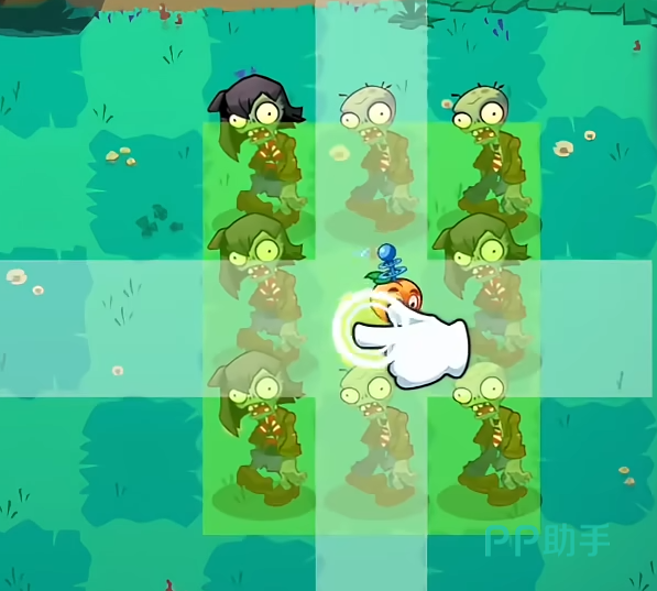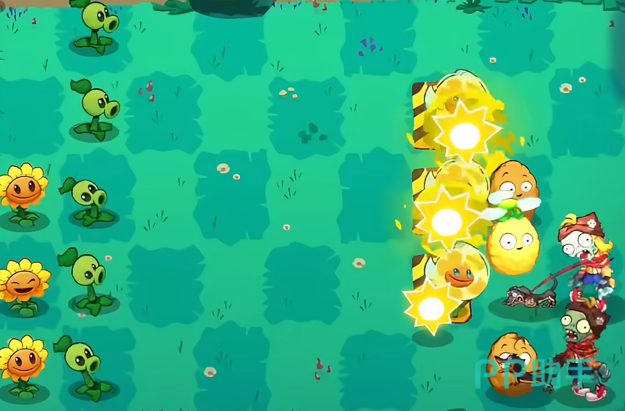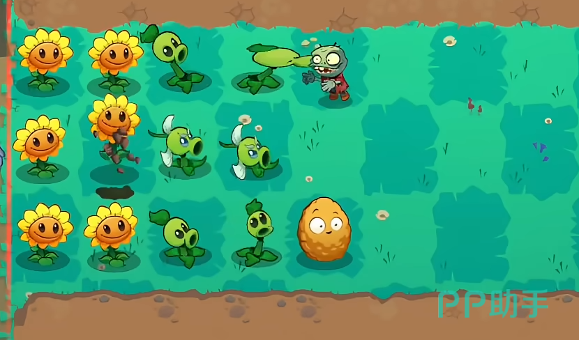 开局建议在后排种植向日葵以稳定获取阳光资源,其余位置(除最后一排外)优先布置豌豆射手。由于第二行出现的敌人较多,推荐在前方放置坚果进行防御,并在中间区域部署吹风草,以有效阻挡敌方推进。待局势稳定后,再补全最后一排的输出火力。当敌群密集时,及时使用脉冲黄桃释放眩晕效果,缓解防线压力。
