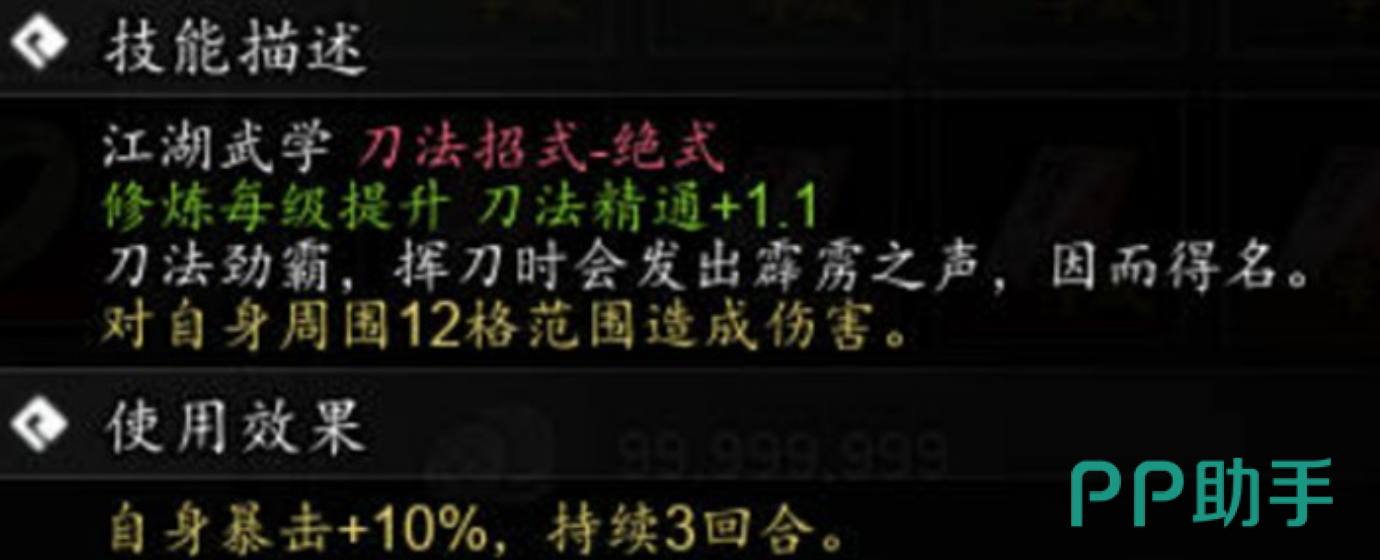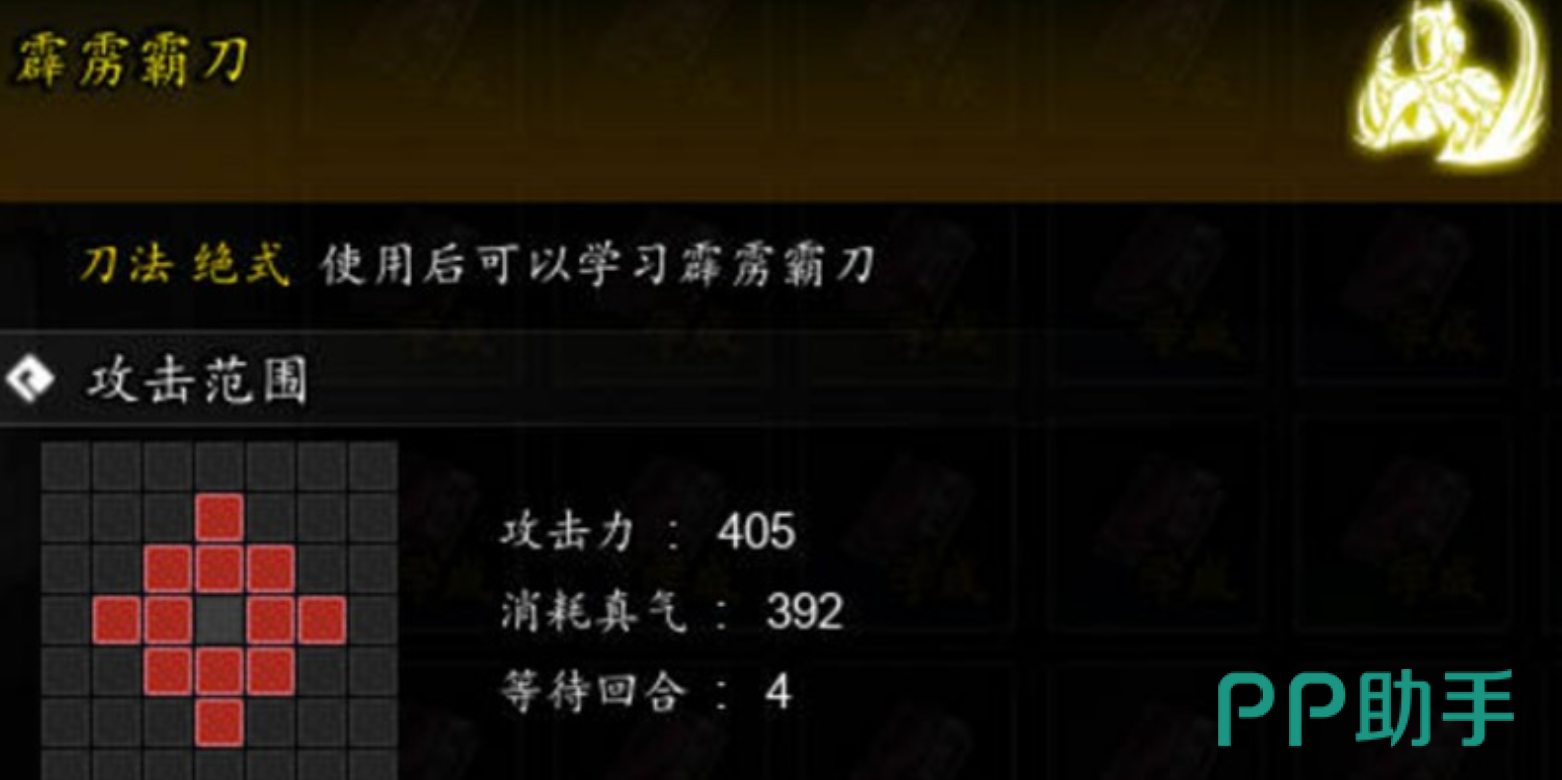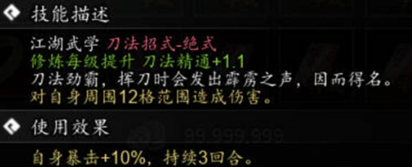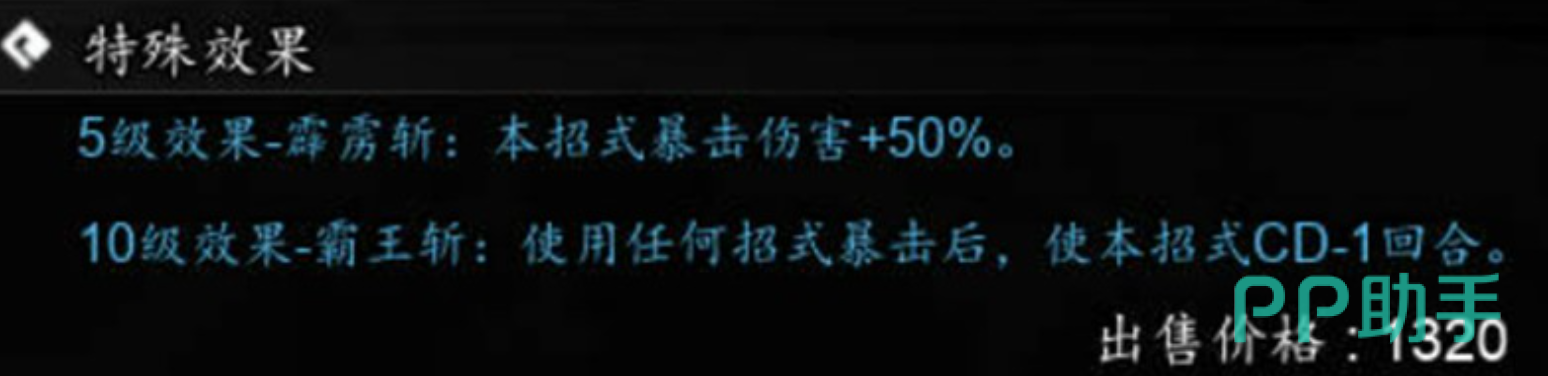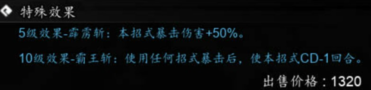 技能成长路径清晰明确:升至5级后激活“霹雳斩”特性,暴击命中时伤害额外提高50%;达到10级则解锁“霸王斩”机制——当其他招式触发暴击时,霹雳霸刀冷却时间减少1回合。双重机制叠加,大幅增强连招密度与瞬时爆发上限,使刀法流派真正具备“一招定胜负”的战术价值。