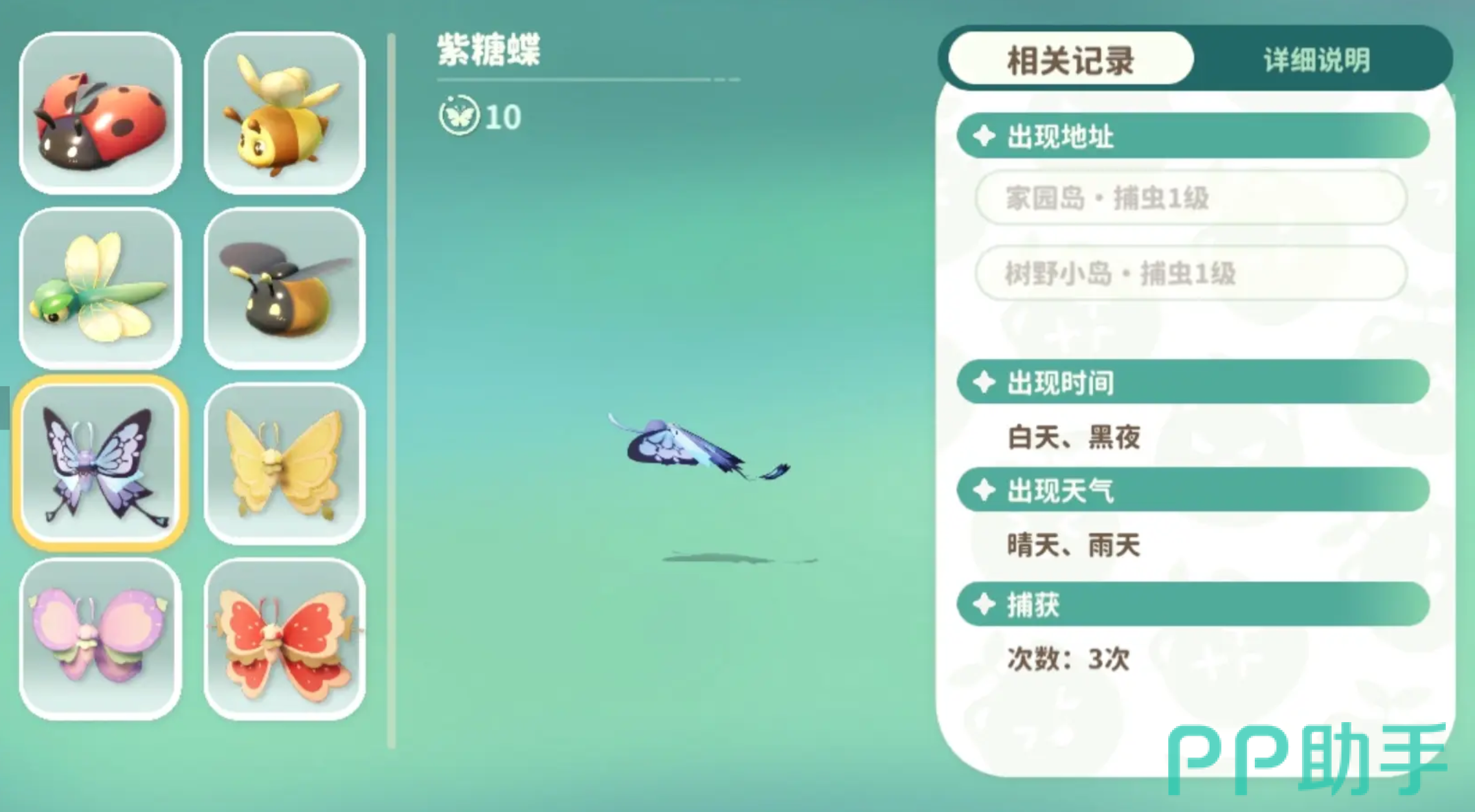 紫糖蝶作为一种昆虫,它有紫色的翅膀并且带有弹力状的斑点,在游戏初期的时候特别容易捕捉到,它属于蝴蝶当中的一种,一般在家园岛素野小岛当中很容易捕捉,通常在白天黑夜它都会出现,当然在晴天跟雨天当中也是特别容易出现的,其实在昆虫当中蝴蝶系列的还有草莓碟,这个就是拥有粉色的翅膀,看上去就跟草莓切片差不多,而它经常出没在花丛的附近。目前草莓碟主要分布在巨树之岛和树野小岛。其实玩家要注意,在巨树之岛和树野小岛当中还有葡萄蝶,这种葡萄蝶拥有紫色的翅膀,在翅膀上面会带有葡萄串的纹理,飞行的轨迹就跟波浪形差不多。