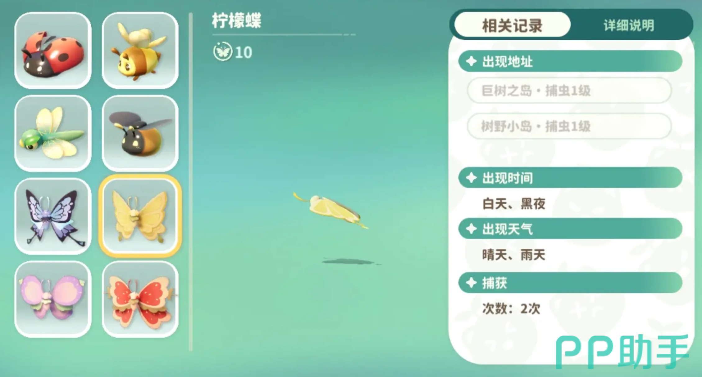 玩家需要注意,在巨树之岛跟树野小岛当中还有柠檬蝶。柠檬蝶拥有黄色的翅膀,并且带有柠檬切片的图案,特别喜欢阳光比较好的地方。另外小橘蜂分布在家园岛跟树野小岛当中,通常出现的时间是白天跟黑夜,晴天跟雨天也会出现,它拥有成黑相间的条纹,飞行的时候会发出嗡嗡的声音,特别容易被惊动。