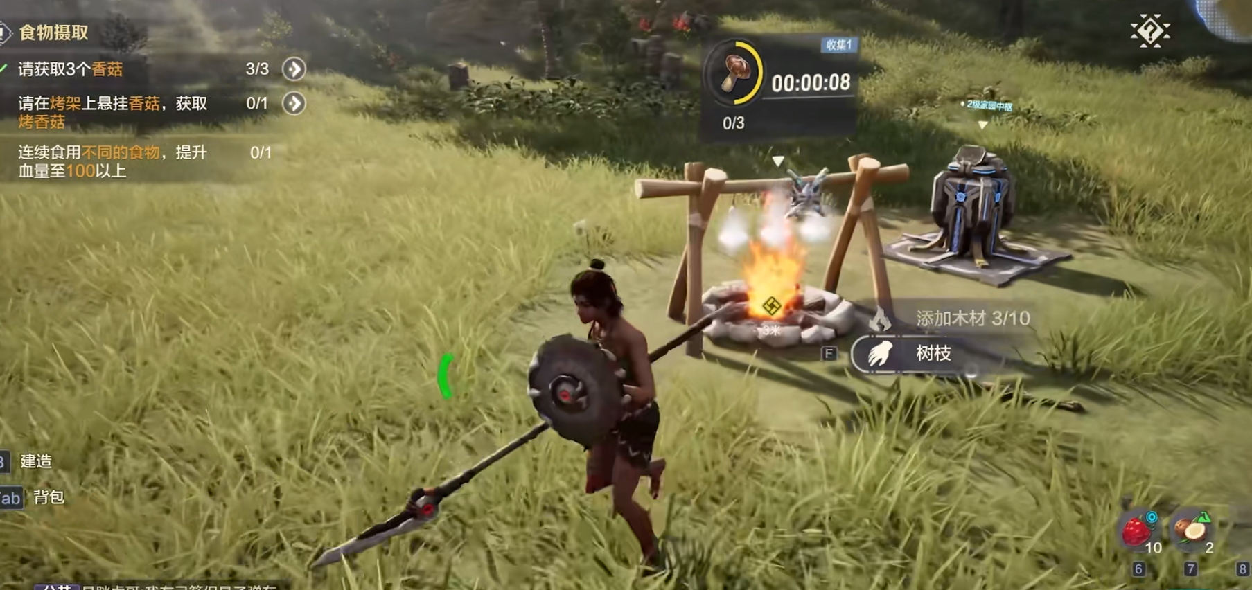 烤香菇也是比较实用的食物,食用之后同样可提升血量和耐力上限。香菇的常见刷新点是枯木或者是灌木丛,玩家需要去刷新点采集,然后利用烤架烘烤而成,因此制作烤香菇会额外消耗木材。