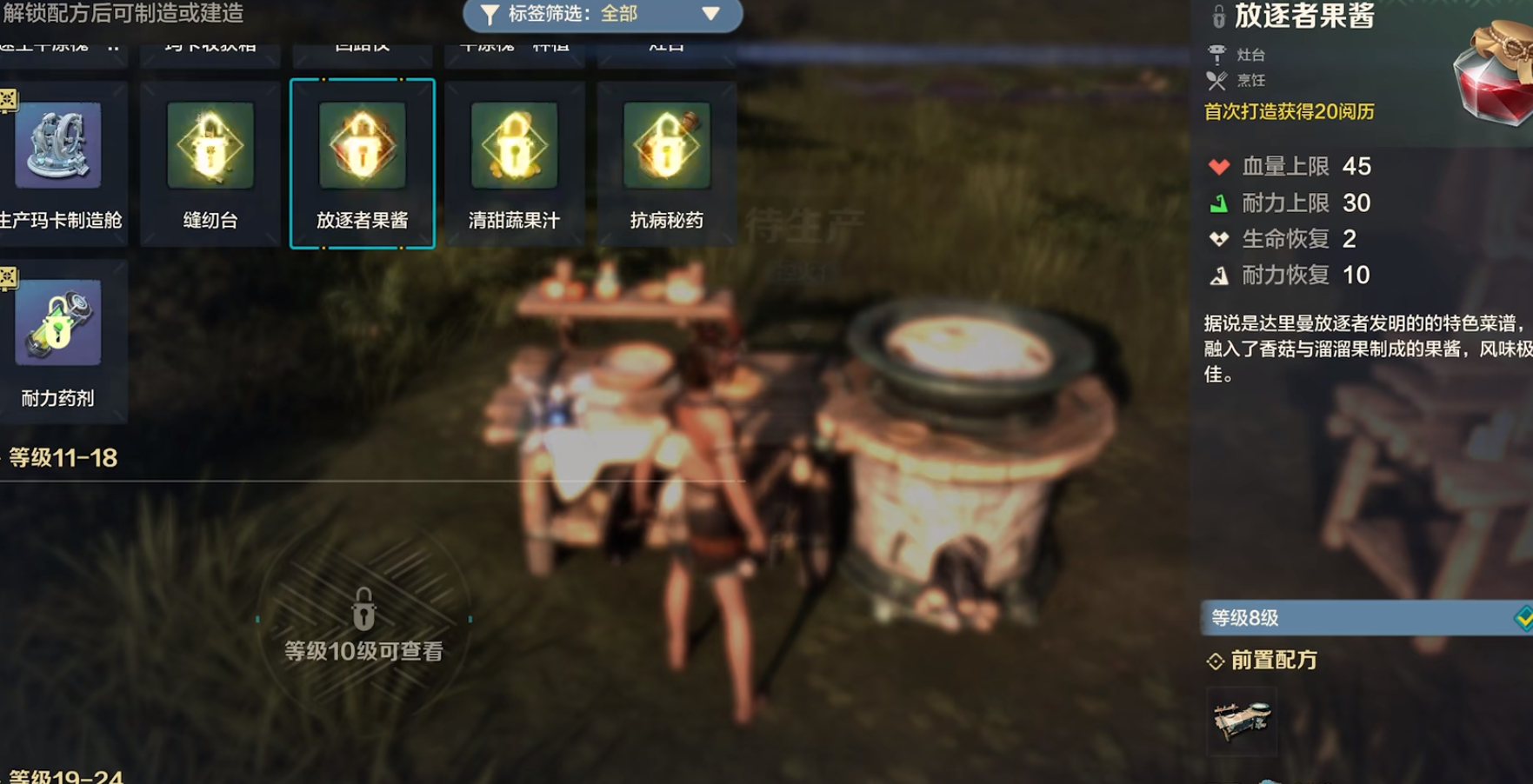 放逐者果酱,它是由溜溜果和烤香菇利用灶台制作而成。食用之后可以帮助获得高额的血量加成,同时还能增加自身的闪避和攻击次数,非常适合打boss的时候食用。