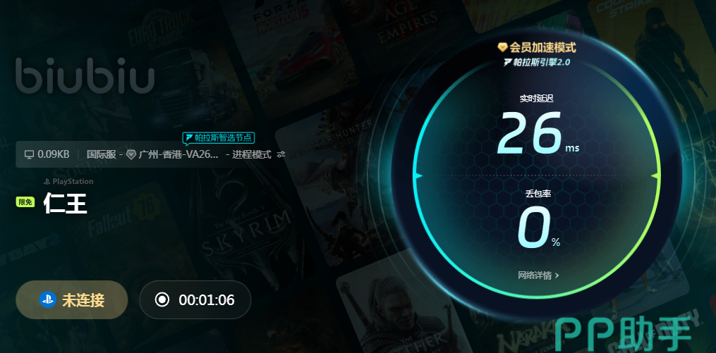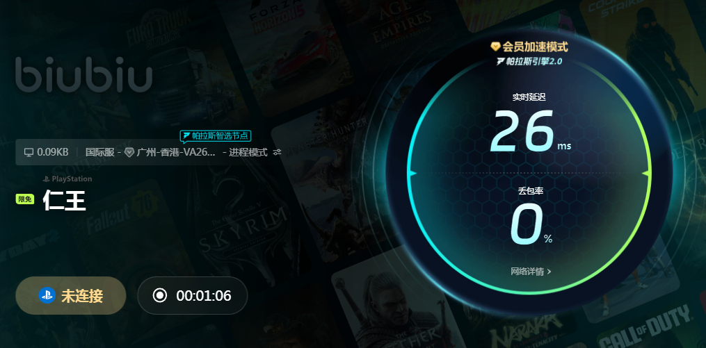 玩过仁王的玩家都表示,游戏就像一个时间海绵,只要进入游戏开始玩就会忘记时间,不管是它浓厚的历史感还是爽快的打斗体验都让人沉迷。游戏时间变长以后大家发现网速越来越慢,哪怕一开始很流畅,玩到一半也会掉帧。biubiu能够长时间保持网络的稳定,性能优越,特别适合用来玩仁王,只要点击蓝色按键即可加速。