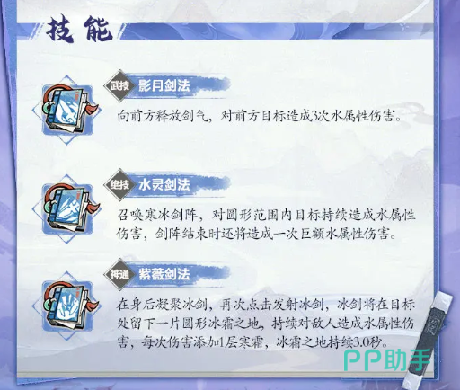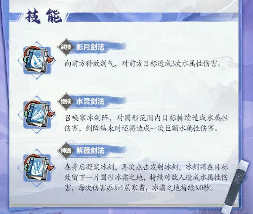 紫薇剑法:可以在身后凝聚冰剑,在点击发射之后,就可以留下一大片的冰霜之地。可以持续性的给敌人产生水属性伤害,并且每一次伤害还会增加寒霜。因此在这些细节上就应该注意起来,合理搭配之后就能拥有好的作用。