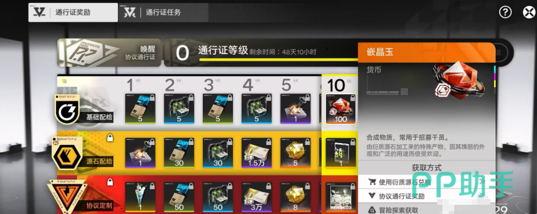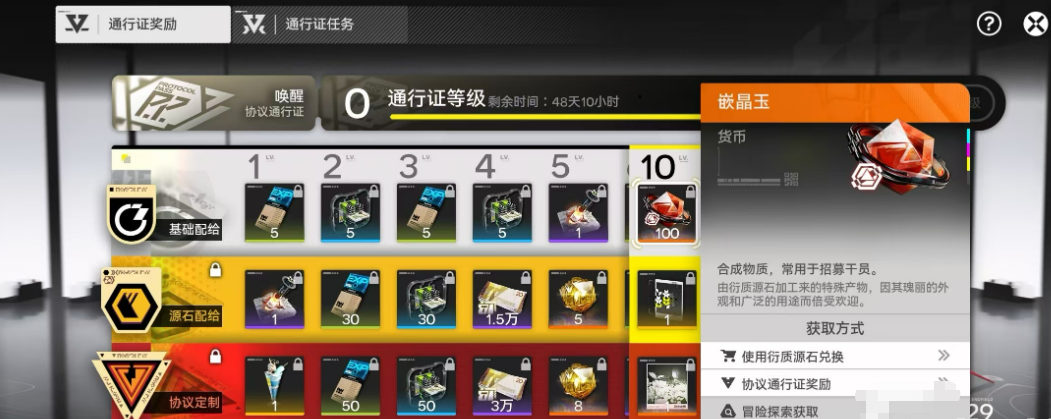 协议通行证提供长期稳定收益:售价68元,激活后随等级提升解锁阶梯式嵌晶玉奖励。该系统不设体力消耗门槛,日常任务与探索进度均可推动等级成长,综合性价比显著高于单次充值,适合中长期活跃玩家配置。
