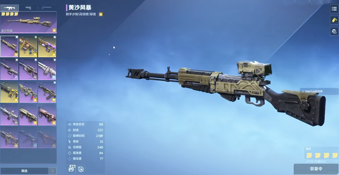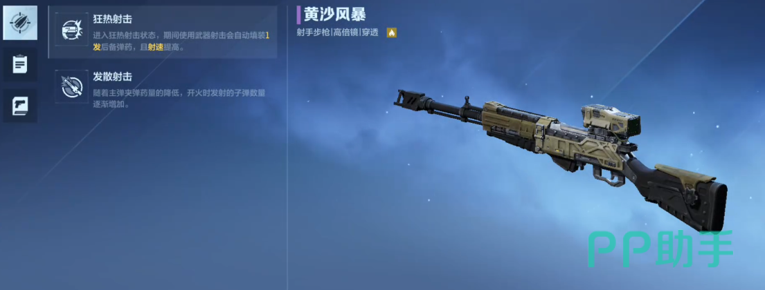 黄沙风暴为紫色品质步枪,基础属性稳定,不依赖高稀有度堆叠强度。其核心优势在于双技能协同逻辑:1技能【狂热射击】触发后进入持续5秒的狂热状态,期间自动补充1发子弹,并提升有效射程判定;2技能【发射射击】则随主弹匣剩余子弹数递减,逐步提升单次扣动扳机所释放的弹丸数量——当弹匣仅余1发时,可一次性倾泻5枚子弹,形成爆发式清场能力。该机制使其在副本单人挑战与PVP残局收割环节均具备显著战术价值。