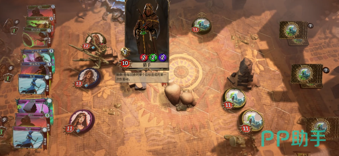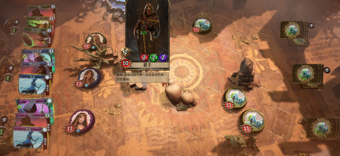 战士职业强调生存韧性与节奏压制,推荐核心卡牌为【肾上腺素】(提升基础攻防属性)、【煽动】(赋予免疫负面状态效果)、【庇护】(提供护盾类防御增益)及【推进力】(触发条件:上一张打出的为进攻类卡牌,可额外抽一张卡)。该组合兼顾承伤能力、抗控稳定性与资源循环效率。猎手则侧重远程输出精度与爆发连招,首选【集中精力】(恢复精力值)、【瞄准】(强化单体伤害)、【神枪手】(提升远程攻击倍率)与【夜魇之蝠】(附加伤害加成效果),形成高机动、高响应的狙击体系。
