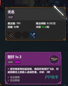 选择该流派后,玩家会直接获得专属武器“无名法杖”,这是狴犴套装自带的核心装备。该法杖内置两个核心技能:“狴犴飞剑”与“审判”,这两个法术构成了整个流派的主要输出手段,无需额外获取或刷取,开局即拥有完整基础配置。