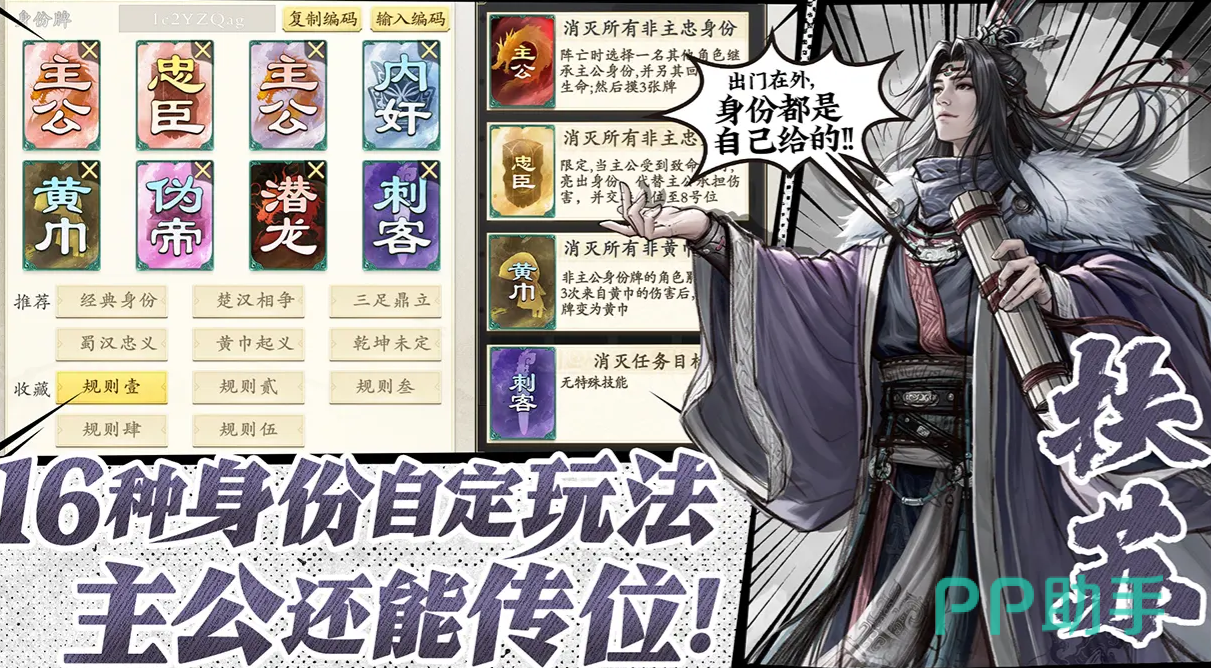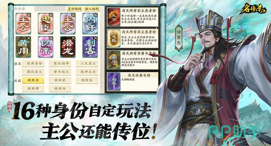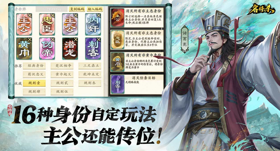 在核心玩法方面,名将杀提供了主公、忠臣、反贼、内奸四大基础身份,并加入了伪帝、黄巾、潜龙、刺客等特殊身份设定,每位身份拥有独特的胜利条件和行动策略。例如,当主公阵亡后,可指定一名角色继承其身份并获得额外手牌支持;若黄巾势力被非主公角色击败,则击杀者将获得奖励卡牌,进一步提升战斗变数。