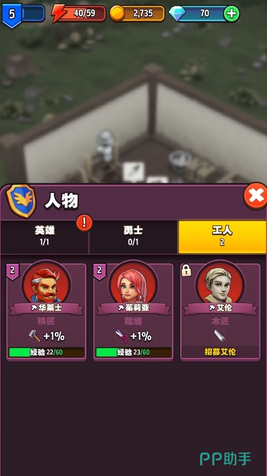 招募到的工人可在人物界面里查看他的详细情况,并且玩家每次完成对应装备的制作,还能让工人获取经验,升级后能制作更多新的装备,是游戏内的主要养成玩法之一。此外,大部分工人都能免费在游戏里招募到,少部分工人需要在商店里用付费货币来进行招募。