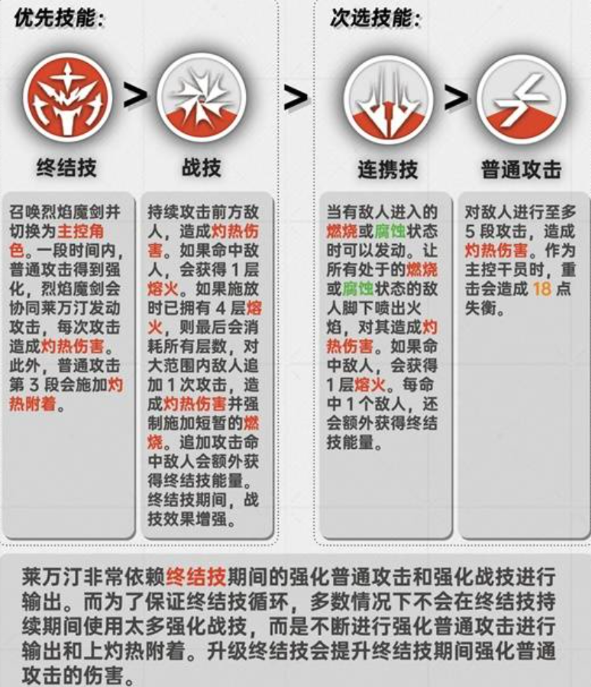 莱万汀的核心战斗逻辑建立在“熔火层数”体系之上。其普通攻击与重击可对敌人施加灼热附着,并通过吸收已存在的层数触发技能效果。当消耗层数释放战斗技能时,不仅能造成额外伤害,还能显著加快终结技能的能量积攒速度;而连携技能同样具备充能加速功能。其终结技能是整套输出循环的爆发支点——开启后不仅强化普攻形态,更赋予大范围斩杀判定,在清场与压制关键目标时表现极为突出。