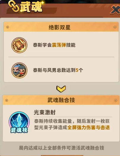 风男与泰斯组成的融合技名为「光束激射」,属于范围击退型战术技能。该技能生效需同时达成三项硬性条件:第一,风男与泰斯必须共同编入当前出征小队;第二,泰斯技能栏中必须已习得并启用「震荡弹」;第三,小队内风男与泰斯的总数量之和不得少于5名。任一条件未满足,技能即无法触发。