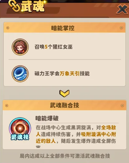 另一组组合为猩红女巫与万磁王,对应融合技「暗能爆破」,属于聚怪+爆发双阶段复合伤害类型。其触发条件为:万磁王须掌握「万象天引」技能,猩红女巫在小队中的总数不少于5名。二者缺一不可,人数门槛不可妥协,技能未点亮亦无法启动融合流程。