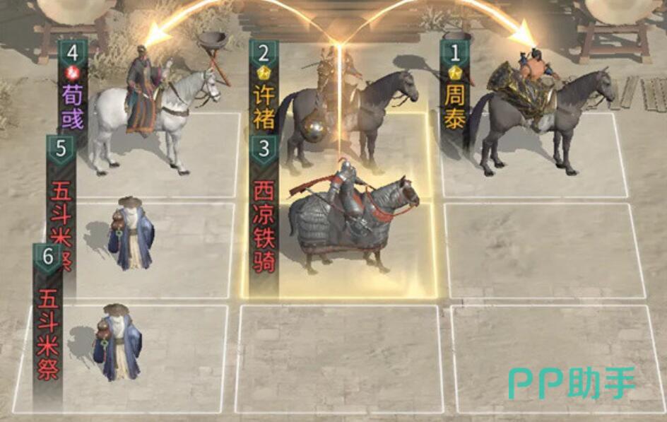 站位设计上,必须确保许褚处于周泰与荀彧的追击范围内,以同步触发【鼎力相助】的增伤效果及【守身相护】的保护判定。推荐布阵:前排中央为许褚,周泰居左前侧,荀彧置右后侧。兵种配置方面,许褚下方适配西凉铁骑,强化前排抗压性与冲锋先手权;荀彧下方部署双五斗米祭,利用其被动协同机制,延长【王佐之才】与【鼎力相助】的生效时长,并提升全队持续作战能力。该配置兼顾启动速度、技能覆盖率与资源利用率,是当前版本实测表现最均衡的方案。