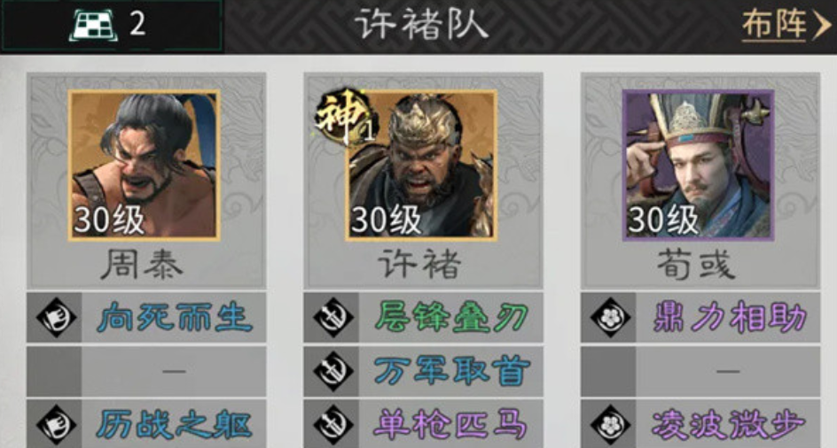 阵容核心许褚定位为战术终结者,其天赋技能【背水一战】可强制锁定敌方武力值最高的单位,触发一对一决斗机制,大幅压缩敌方关键输出的存活时间。该效果不依赖概率判定,具备高度可控性,是点杀体系成立的前提基础。周泰则承担前排屏障职能,天赋【守身相护】提供稳定的伤害转移能力;主动技【向死而生】在自身受到攻击后,自动为我方血量最低单位施加治疗与减伤双重效果,显著提升队伍容错率与残局处理能力。