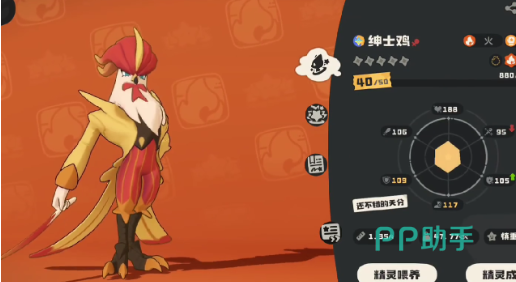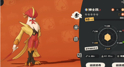 冰灵绅士鸡属于火属性定位的高输出型角色,具备优秀的双攻能力,无论是魔法攻击还是物理打击都有出色表现。初始状态下,它的攻击值为106,生命值可达188,基础属性已属上乘。而一旦完成进阶进化,整体实力将迎来质的飞跃——最终形态下攻击数值可提升至380点,输出潜力极为惊人。战斗中的它身穿燕尾服,外形优雅却不失霸气,兼具视觉美感与实战威慑力。