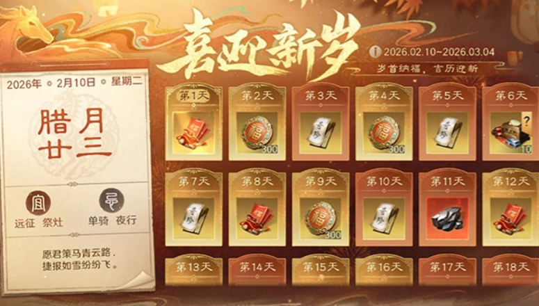 【福运临门】为周期性幸运抽奖玩法,活动期为2月10日至3月3日。抽奖卷可通过“百戏游园”与“元夕灯谜”两大日常活动稳定获取。开奖日定于2月17日、2月21日、2月24日及3月3日四天,单次最高可得黄金2026枚,助力玩家快速补充战略储备。