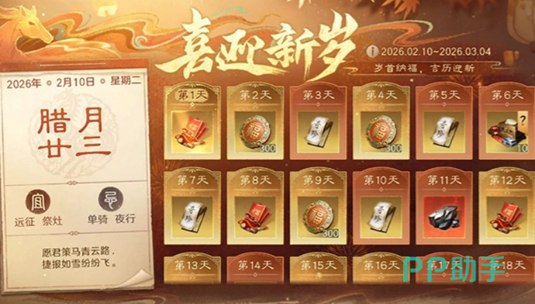 【新春贺礼】活动自2月10日持续至3月4日。满足历史繁荣度≥2000且所在服务器为3月4日前开启的赛季1或更早服,即可每日登录领取全服抽奖卷、奇珍礼卷等高价值道具。此外,在2月9日至2月22日期间,每位角色还可限时领取一次新春福利礼包,内含珍品打造素材宝箱及点化石,均为装备制造与武将养成中的关键消耗材料。
