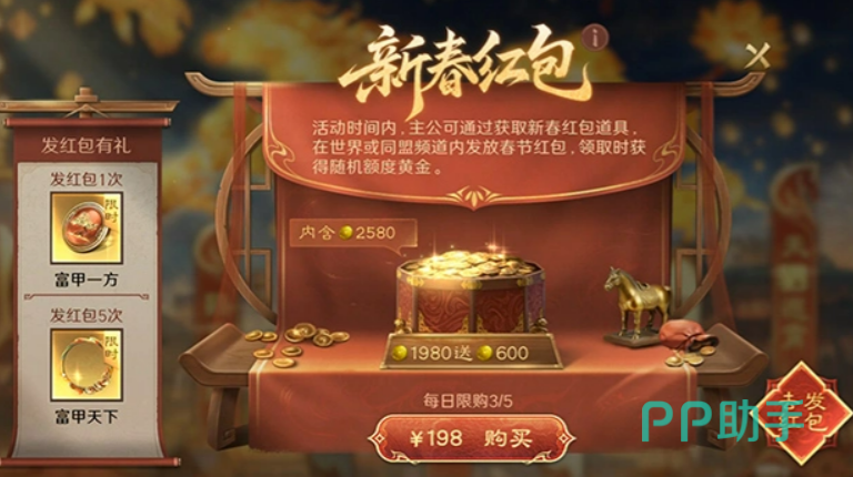 【红包系统】支持社交互动与成就收集双重目标,活动延续至3月24日。玩家获得黄金红包或玲珑玉红包后,可在世界频道或同盟频道发放,每次成功发送均可激活限时徽章——“富甲一方”与“富甲天下”。徽章具备唯一性与展示价值,建议有收藏需求的玩家合理规划发放频次。
