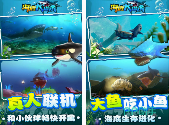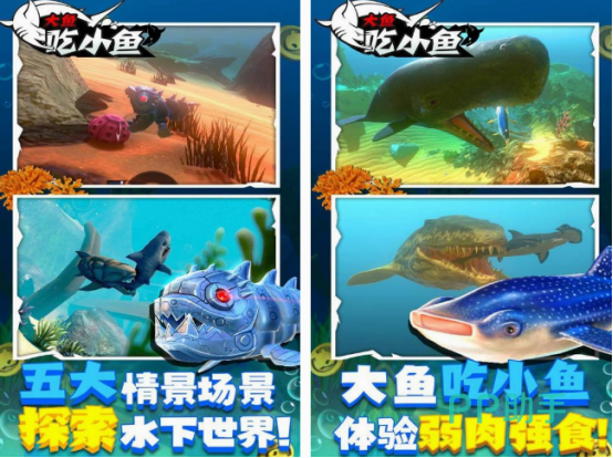 这款以海底鱼儿生存法则为主要内容的游戏,你将展开与鱼之间的大作战,里面既有庞大的鲨鱼,同时还有体型小的鱼儿以及人类,需要在面对鱼类的时候及时的躲避。当然体型庞大的鲨鱼,也会不断的吃比自己体型小的生物,包括各种小鱼以及人类。在游戏开始以后,你就会置身于海洋的环境中,面临复杂的挑战时一定要以生存为任务。
