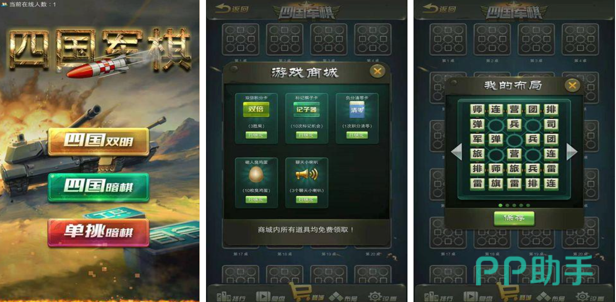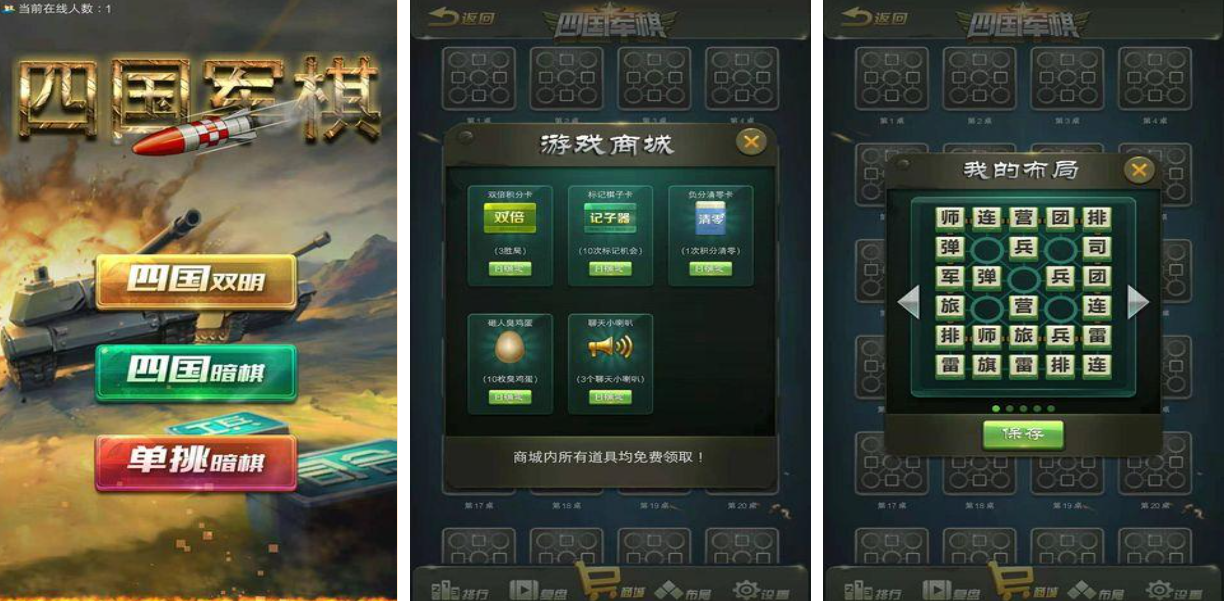 这是款支持四个军棋高手同台竞技的联机作品,军旅背景跟公平军棋玩法更是交相融合,游戏商城中可兑换各种军棋棋子和棋盘,主题各异的背景呈现让军棋高手感到很新鲜,超前的竞技元素加持也是军棋粉丝的最爱,自定义布局的特殊军棋设定不会让人失望,军棋高手和小白均可安装这款对弈神作。