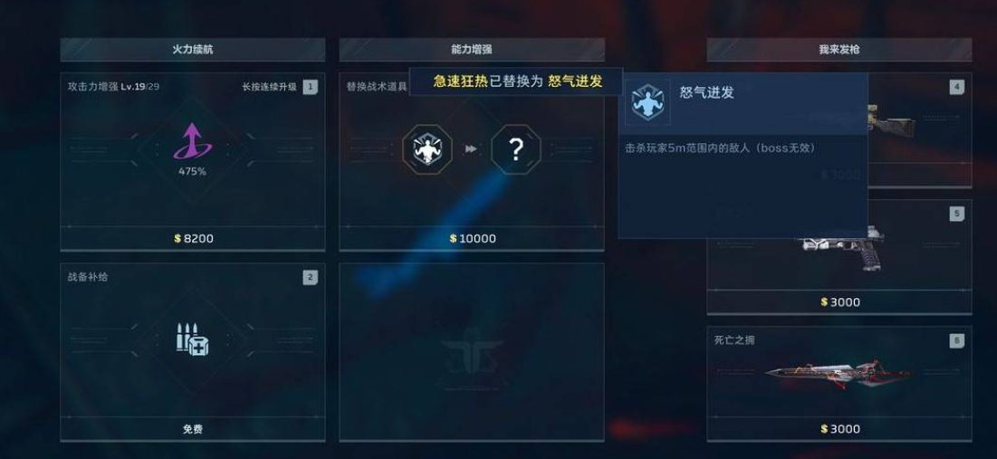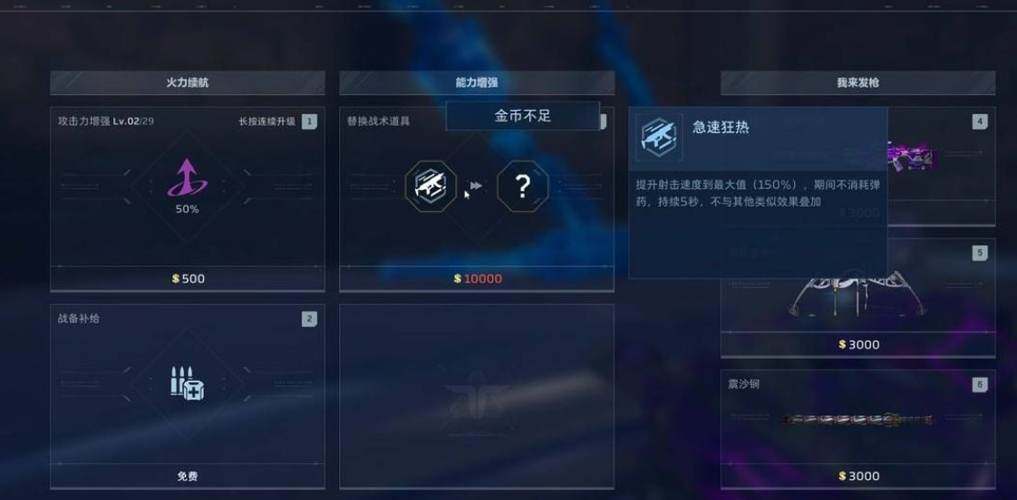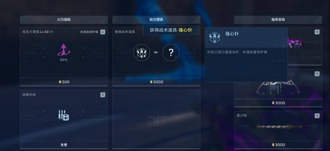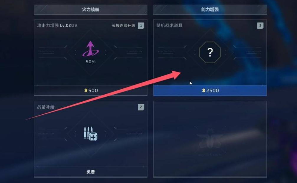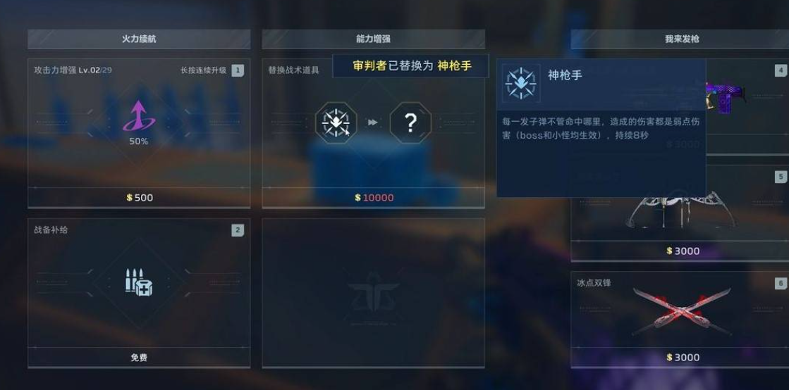增益效果在猎场模式中以战术道具形式呈现,需通过猎场商店使用金币购得。初始售价为2500金币,随刷新次数递增,封顶价格为10000金币。该设定鼓励玩家根据关卡节奏与资源储备,制定差异化的采购策略。