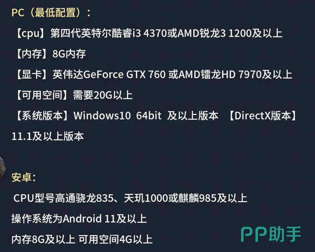 再来看PC端的配置设定。最低配置要求CPU具备i34370或相近性能水平,显卡方面需配备GTX760及以上型号,系统内存不少于8GB,并准备20GB可用存储空间。在此配置下,虽然可以进入游戏,但可能会遇到加载缓慢或运行卡顿等问题。
